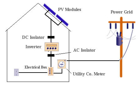 Diagrams of how a grid tied solar panel system is connected.